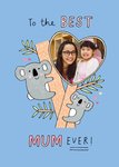 Front of card: Illustration of 2 koalas climbing trees on blue background with heart photo frame Text reads: "To the best Mum Ever!" With editable photo.