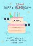 Front of card: Illustration of two tier birthday cake with candles and party hat holding weights, surrounded by confetti on a blue background. Text reads: "Happy Cheatday! Enjoy working it all off at the gym tomorrow!"