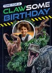 Front of card: A high-energy dinosaur birthday card withroaring raptors, a jungle backdrop and hazard-stripe accents. A circular frame in the centre lets you add a favourite photo for a personal touch. Perfect for dino-loving kids.