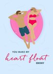 Text reads: "You Make My Heart Float Ebony". "Ebony is editable" The rear of the card background colour is pink with the Just Peachy logo in the center.