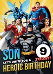 Front of card: Featuring an illustration of Blue Beetle, Superman, shazam, Wonder Woman and Batman. Text reads: "Son let's unite for a heroic birthday 9 today!". '9' can be personalised!