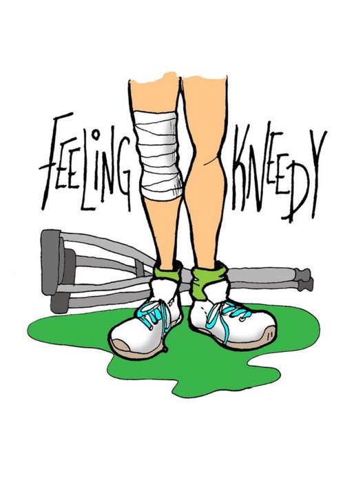 Cartoon Illustration of some legs with a bandage on the knee with text