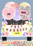 Front of card: Illustrated colourful wedding car covered in confetti, balloons and flowers. Text reads: "Eric. Maria. Just Married. 12.07.25". Editable name and date.