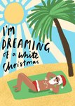 Front of card: Illustrated sunny beach with man sunbathing in Santa hat and black hand lettered typography Text reads: "I'm dreaming of a white Christmas".
