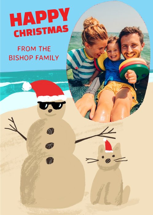 Illustration Of a Beach Snowman and Cat with Santa Hats above this is a large photo upload