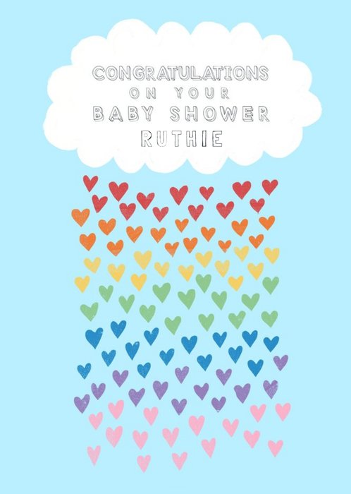 Katy Welsh Illustration of Cloud Raining Hearts Personalised Congratulations On Your Baby Shower Car