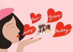 Cute illustration of lady in pink beret blowing kiss with three text hearts and a photo upload heart on a pink background.