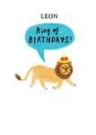 Front of card: Featuring an illustration of a lion wearing a crown on a white background. Text reads: "Leon king of birthdays!". 'Leon' can be personalised!