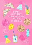 Front of card: Illustration of party drinks, hats, balloons and food with text on a pink background. Text reads: "Happy Birthday Granddaughter Have a sweet day."