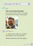 "Message Chat Bot AI... You. This is my friend Dominic. Can you write them an age-related Birthday message? CHAT BOT AI. Sorry, their age is a number too high for me to calculate. Please rephrase and ask again..."