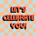Featuring bold orange 3D text with black shadowing that reads “Let’s celebrate you!” set against a retro-style orange and light blue checkerboard background. The design is bright, energetic, and perfect for any celebration.