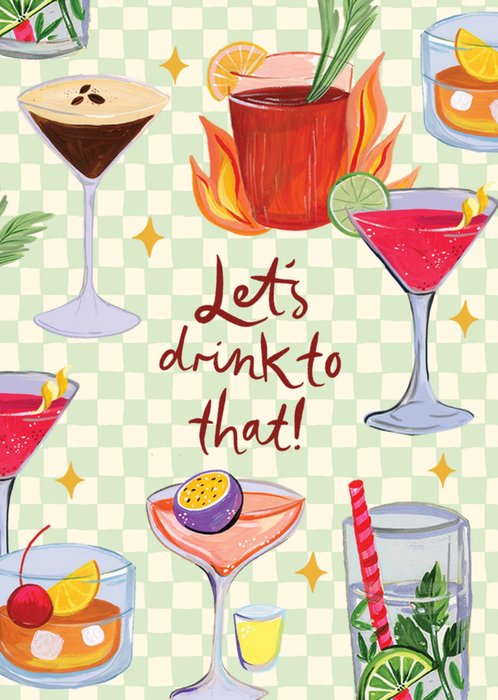 A vibrant design featuring illustrated cocktails, citrus garnishes, and hand lettered text on a light green gingham background.
