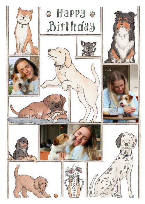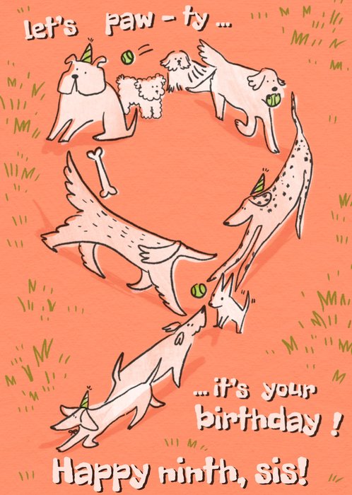 Front of card: Featuring a cute illustration of dogs in the shape of a number nine. Text reads: "Let's paw-ty... It's your birthday happy ninth, sis!". 'Happy ninth, sis!' can be personalised!