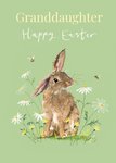 Front of card: Featuring a very sweet hand-painted illustration of a bunny rabbit sitting amongst some daisies with a couple of bumblebees flying around.
