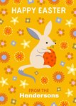 Front of Card: Illustration of a Bilby holding Easter egg on a yellow floral background with white typography. Text reads: "Happy Easter from the Hendersons" With editable text.