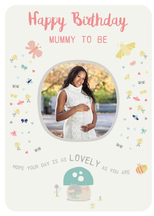 Front of card: A Photo Upload card of a pregnant woman, with text and illustrations around the photo The text reads: "Happy Birthday mummy to be hope your day is as lovely as you are"