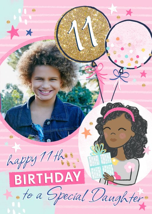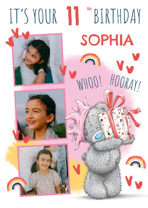 Front of card: Featuring an organic design with flowers wrapping around five photo frames. Text reads: "To a gorgeous granddaughter 11 look how much you've grown!". 'Granddaughter' can be personalised!