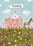 Front of card: Illustration of a girl in a pink princess outfit next to pink horse drawn carriage in a flower field Text reads: "Scarlett" With editable name.