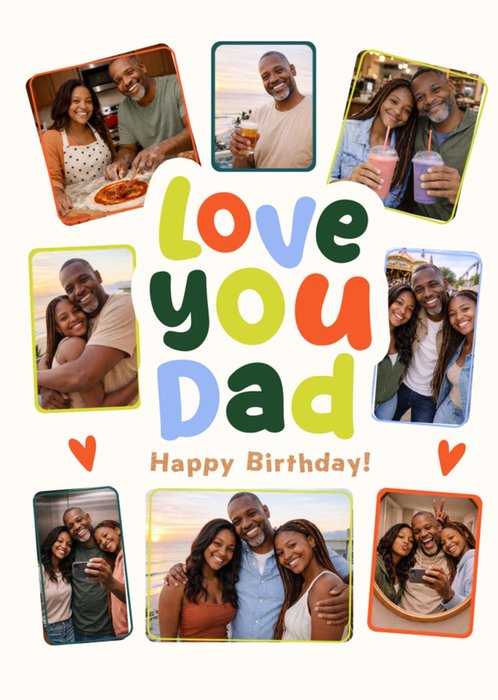 Featuring multicoloured hand-lettered text with two orange hearts on an off-white greeting card, surrounded by eight rounded rectangular photo upload areas across the top, sides, and bottom for Dad’s birthday.
