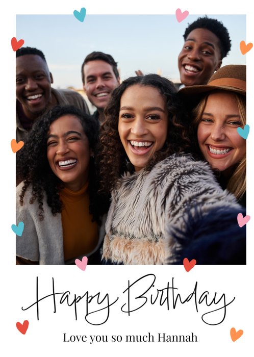 A modern design featuring one photo area with a border of colourful hearts and large script lettering on a white background.