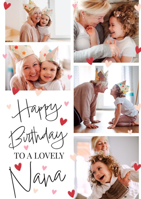Featuring five large photo upload areas arranged at the top and right hand side of the card, surrounded by a confetti of coloured hearts. In the bottom left corner is black, elegant script font.