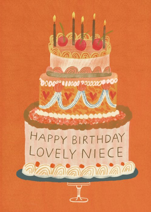 Front of card: Features an illustration of a beautifully decorated, 3 tier Birthday cake topped with cherries and candles against a bunt orange background. On the bottom tier of the cake is text.