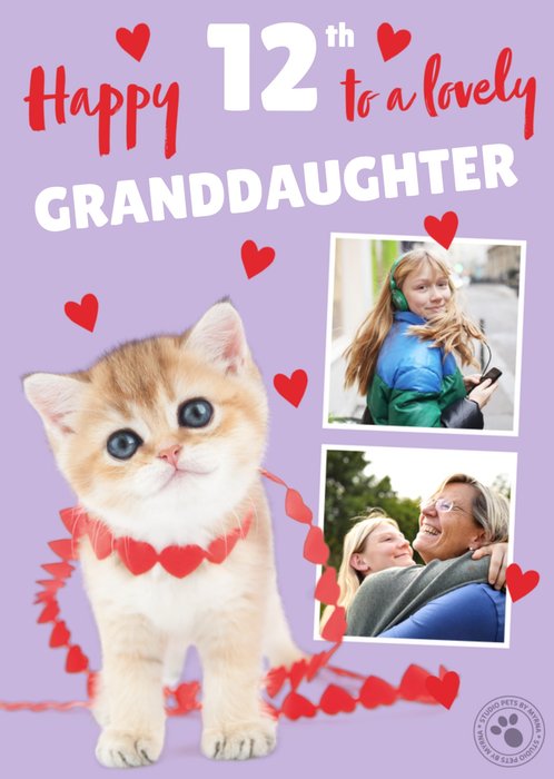 Front of card: Featuring a cute kitten with two photo frames on a purple background. Text reads: "Happy 12th to a lovely granddaughter". '12th' and 'granddaughter' can be personalised!