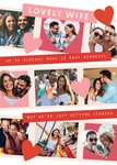 A modern design featuring nine photo areas in a scrapbook style collage with heart shapes and banners on a cream background.