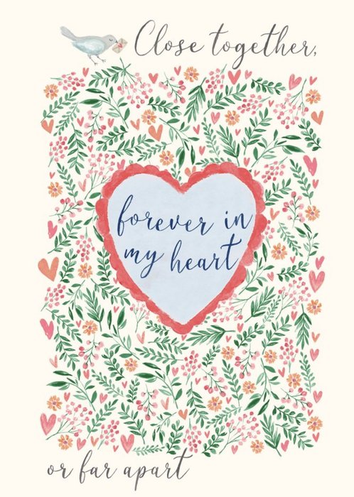 A sweet and affectionate Valentine's Day card featuring a watercolour illustration of a love heart with scalloped edges with a light blue ribbon wrapping around it, the heart is surrounded by flowers, vines with leaves and little red love hearts.
