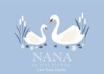 Front of Card: Illlustrattion of two swans on pond with wording below. Text reads: "Nana, on your birthday. Love from Amelia." With editable name.. LR Studio logo. Moonpig logo.