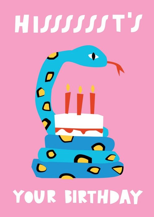 Illustration of a blue snake curled around a birthday cake.Text on a pink background.