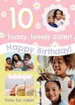 A vibrant and joyful Photo Upload Birthday card featuring a pink background is festooned with white daisies, creating a cheerful atmosphere. It features a prominent golden "10" symbolising the milestone age, alongside four photo upload areas in various shaped frames which will help capture moments of joy and celebration. The overall design of the card exudes warmth and the loving bond of sisterhood, making it a delightful tribute to a decade of memories and the promise of more to come.