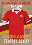 Front of card: Glory Glory Man United Birthday Card Illustration of a Manchester United shirt. Text reads: "Happy birthday Shawn glory glory Man UTD". 'Shawn' can be personalised!