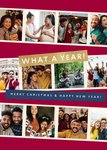 Featuring a collage layout with 12 rectangular photo upload frames arranged across a deep red background. A gold banner displays the phrase “What a year!” and a navy strip beneath reads “Merry Christmas & Happy New Year!”
