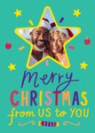 Featuring a photo frame in the shape of the star and vibrant typography surrounded by festive illustrations on a teal background.