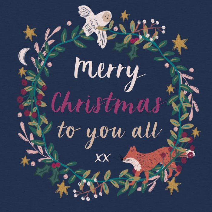 This greeting card features an illustrated woodland wreath with holly, berries, stars, an owl, and a fox surrounding the centre on a deep navy blue background.