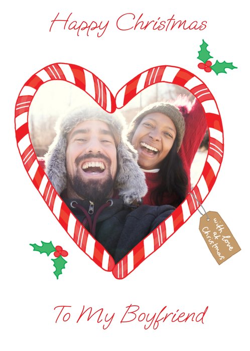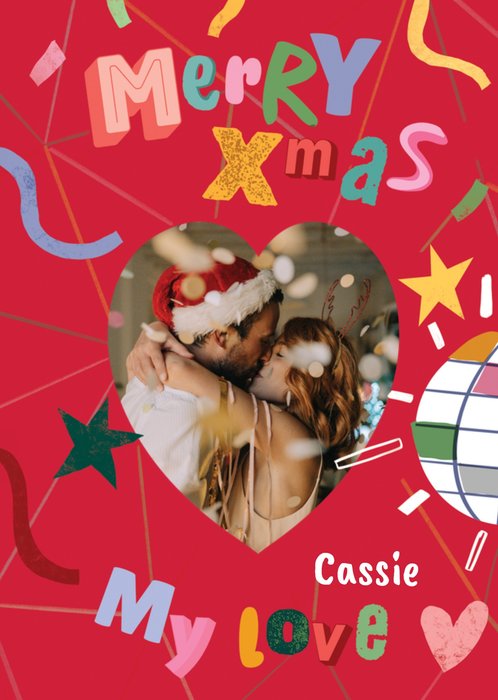 Front of card: Featuring an illustration of a disco ball and colourful confetti with a heart shaped photo frame. Text reads: "Merry xmas Cassie my love ". 'Cassie' can be personalised!