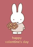 Front of card: Featuring an image of Miffy holding a bunch of flowers, with gold foil effect typography at the bottom of the card, on a rose pink background.