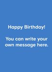 Front of card: This greeting card design features a bold blue background with a central white text block reading “Happy Birthday! You can write your own message here.” offering a customisable message space for personalisation.
