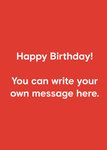 Front of card: This greeting card design features a bold red background with a central white text block reading “Happy Birthday! You can write your own message here.” offering a customisable message space for personalisation.