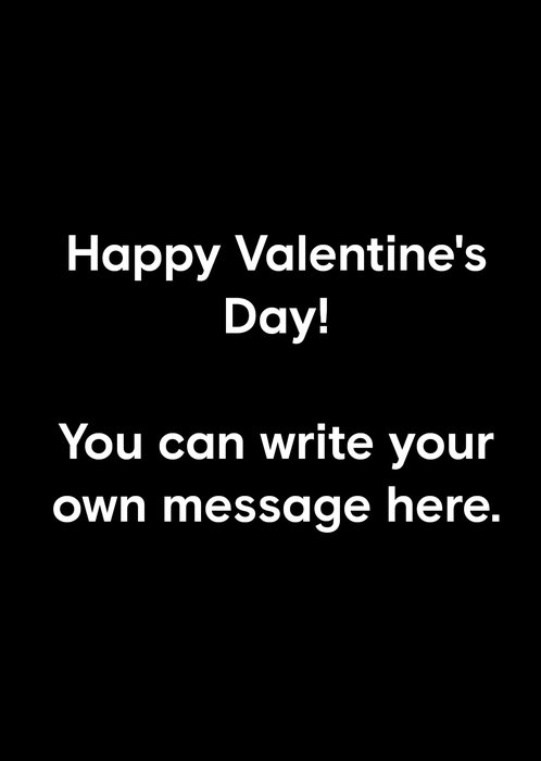 Front of card: This greeting card design features a plain black background with a central white text block reading “Happy Valentine’s Day! You can write your own message here.” offering a customisable message space for personalisation.