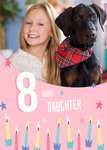 Hoory For Today. Front of card: Pink curved photo frame bottom half of the card with illustrated multi coloured candles and stars. Photo upload covers other top half of the card. Text on the card reads: "8 Today Daughter!". All text is editable. Back of card contains: Hooray for Today logo in matching style.