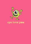 Featuring Mike Wazowski with arms raised, above gold foil-effect lettering on a pink background.