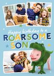 Front of card: Moonpigs Dino Pig Roarsome Son birthday card featuring 3 photo uploads Cute Moonpig wearing a dinosaur costume. Personalised card. Text reads: "Happy birthday to a roar-some son"