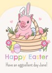Front of card: Featuring an illustration of a Moonpig wearing bunny ears, inside a wicker basket surrounded by Easter eggs and flowers. Text reads: "Happy Easter. Have an eggcellent day Jane!".