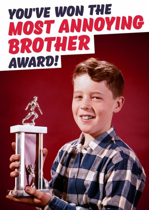 Retro image of boy holding a trophy. Text reads: "You've won the most annoying brother award!"