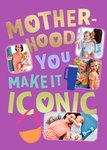 A bold and celebratory greeting card design featuring a purple background, glittery gold and pastel text, fitness and lifestyle illustrations, and multiple photo upload areas, honouring the strength and style of motherhood.