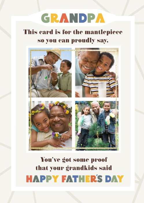 Front of card: Grandpa's Photo Upload Father's Day Card Multiple photo frames with colourful text. Text reads: "Grandpa this card is for the mantlepiece so you can proudly say, you've got some proof that your grandkids said happy father's day".