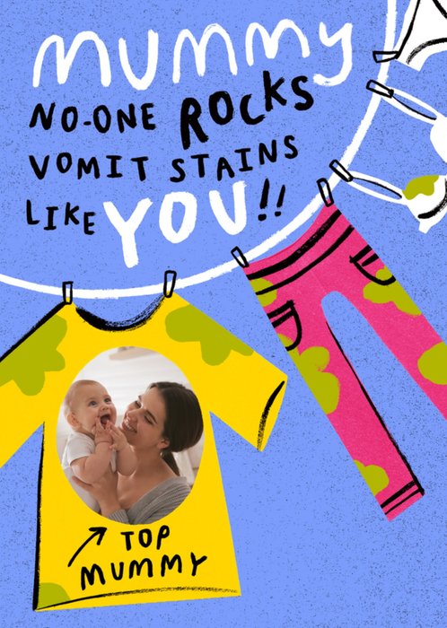 A humorous Mother’s Day card featuring illustrated laundry with stains on a clothesline and a “Top Mummy” t-shirt with a photo upload area, celebrating the messy but loving reality of motherhood.