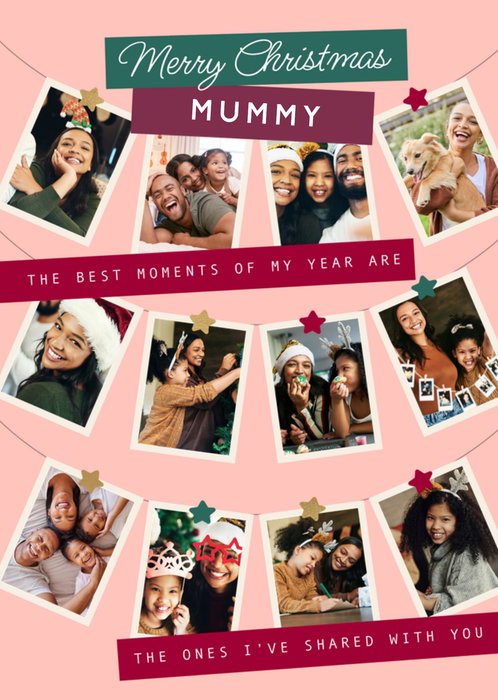 Featuring 12 rectangular photo upload frames arranged in two curved rows to resemble hanging photo garlands, each attached with small star shapes in festive colours. The text appears across green, burgundy, and red banners placed between and below the photo rows. The design includes a soft pink background that adds a warm and cheerful festive feel.